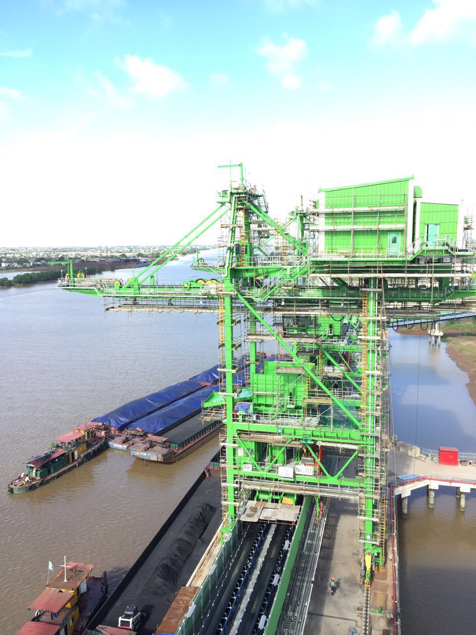 橋式抓斗卸船機(jī),以帶有抓斗的小車沿橋架作周期運(yùn)行的散貨卸船機(jī)。作業(yè)時(shí),抓斗自船艙抓取散貨并提升出倉后載重小車向岸方運(yùn)行,將散貨卸入前門框內(nèi)的漏斗內(nèi),經(jīng)膠帶輸送機(jī)系統(tǒng)送入貨場。