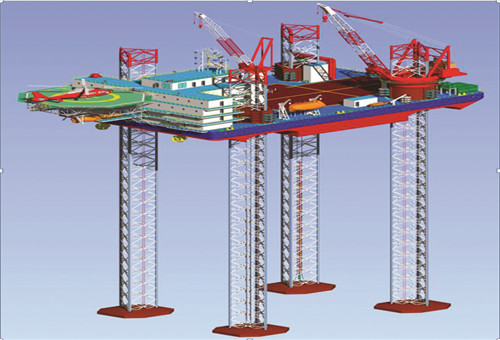 多功能輔助作業(yè)平臺一般配備三到四個樁腿,樁腿采用桁架或圓筒結(jié)構(gòu),具有自行升降功能。作業(yè)時樁腿扎入海床固定,甲板可自由調(diào)節(jié)高度;移動時收回樁腿,依靠甲板浮于海面
