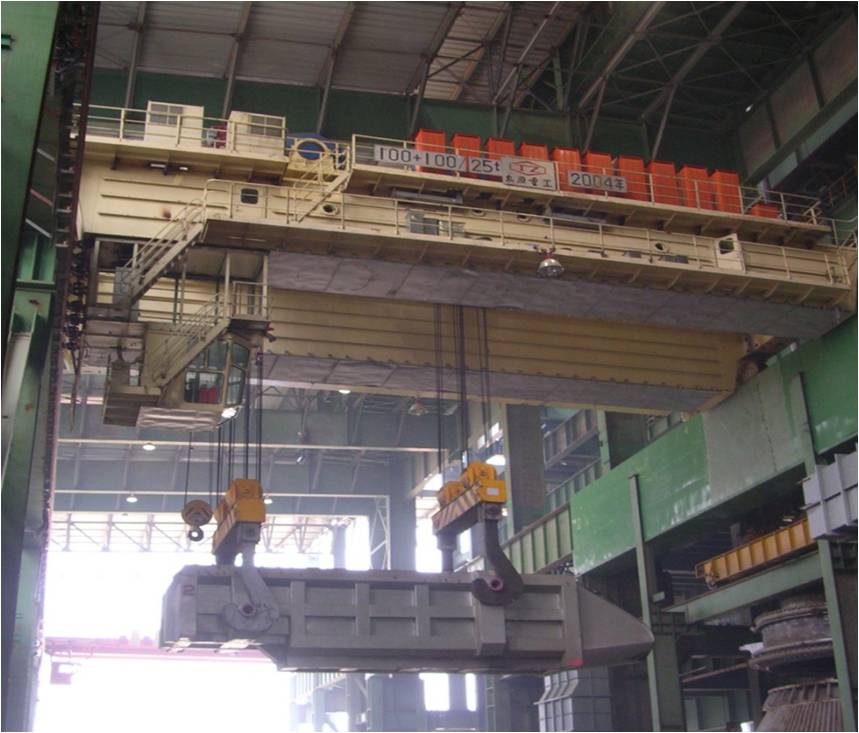 轉(zhuǎn)爐煉鋼過程中配置料箱起重機,主要用于添加冷料作業(yè)。電爐加料起重機主要用于向電爐加廢鋼,與鑄造起重機主要區(qū)別在于主起升機構(gòu)可以不考慮單機工作的工況