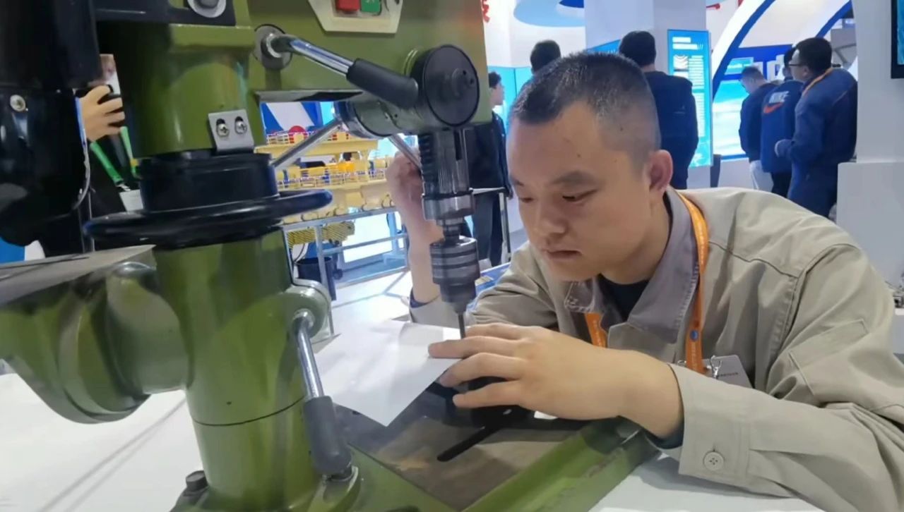太重的產(chǎn)品模型種類繁多,太重職工也大放異彩!在三晉工匠風(fēng)采展示墻上,集團(tuán)公司職工樊志勤、陳賓兩位勞模工匠的照片引人注目,生動(dòng)展示著太重人的精神面貌和工匠風(fēng)采。齒傳分公司職工單璐還現(xiàn)場(chǎng)展示了技藝絕活,引得參觀者駐足圍觀。大家屏息凝神、目光專注,只見操作者在手機(jī)上放置了一張厚度僅有0.1毫米的A4紙,通過手動(dòng)操作臺(tái)鉆在紙張上精準(zhǔn)地打出了圓孔,但手機(jī)屏幕完好無損,出神入化的技藝贏得了現(xiàn)場(chǎng)觀眾的陣陣掌聲。
