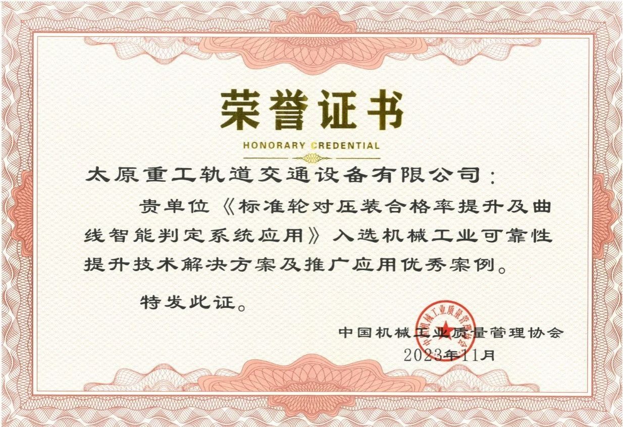 近日,在第八屆全國(guó)機(jī)械工業(yè)可靠性技術(shù)應(yīng)用交流大會(huì)上,太重軌道公司《標(biāo)準(zhǔn)輪對(duì)壓裝合格率提升及曲線智能判定系統(tǒng)應(yīng)用》項(xiàng)目榮獲機(jī)械工業(yè)可靠性提升技術(shù)解決方案及推廣應(yīng)用優(yōu)秀案例,是山西省唯一入選該獎(jiǎng)項(xiàng)的企業(yè)。