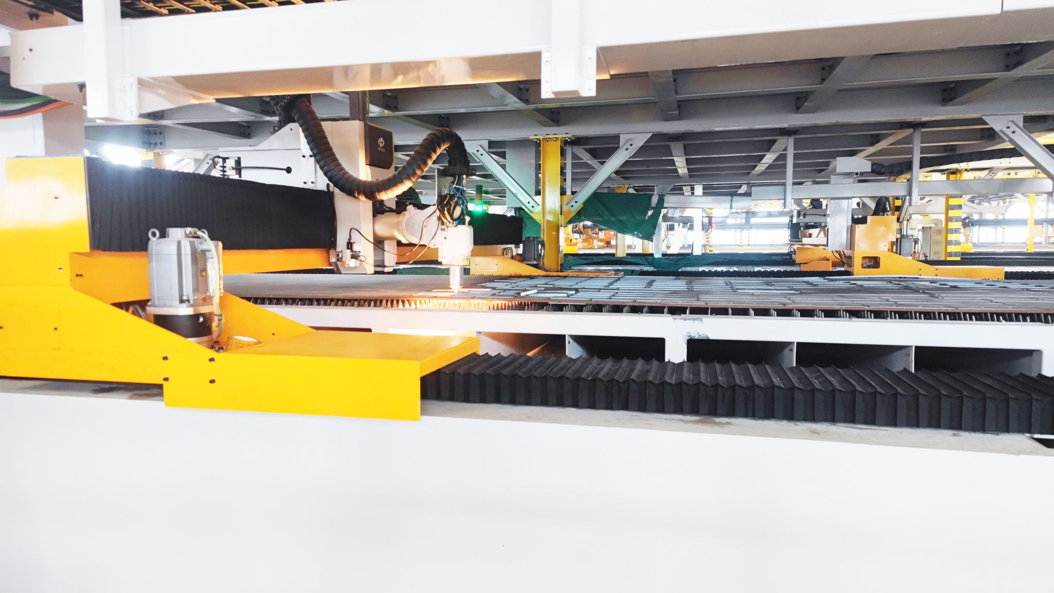 一張鋼板,經(jīng)過出入庫、拋丸、校平、上下料、對(duì)中、噴碼、輸送、切割、分揀、砂光、碼垛、物流轉(zhuǎn)運(yùn)全流程自動(dòng)運(yùn)行,即可輸出一批高質(zhì)量合格零件,下料工序周期大大縮短?!斑@條實(shí)現(xiàn)全過程智能化管控的黑燈產(chǎn)線,效率提升70%,綜合材料利用率高達(dá)90%,滿產(chǎn)下每年可節(jié)約成本4000萬元以上?!敝悄芗庸づ渌椭行目偨?jīng)理史亞杰說。