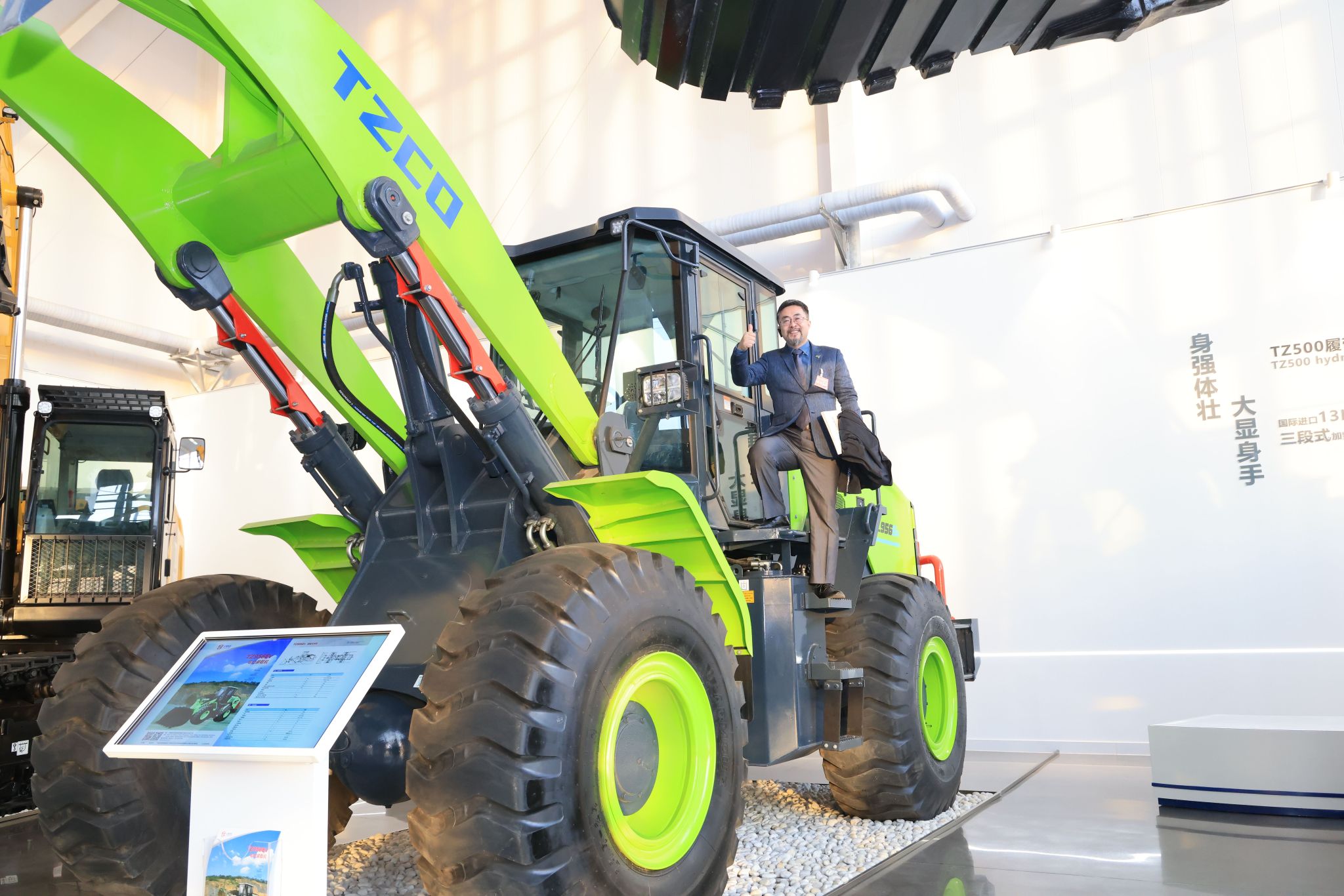 在政府工作報告提出“發(fā)展綠色低碳產(chǎn)業(yè)”的背景下,展廳內(nèi)綠色化實物展區(qū)展出的太重氫燃料液壓挖掘機、電動液壓挖掘機、電動裝載機等新能源產(chǎn)品,成為當之無愧的焦點。當了解到“綠色是太重裝備的鮮明底色”后,首次參觀的俄中文化交流協(xié)會執(zhí)行會長喬翔鵬直呼“震撼”,決定與太重電動裝載機來一張“有高度”的合影,“太重真‘氫’、太重真‘重’、太重真棒!”,他豎起大拇指脫口而出的短短12個字,洋溢著對公司轉(zhuǎn)型成績的肯定、對山西制造業(yè)騰飛的贊佩。