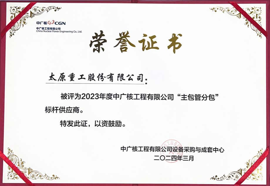 近日,太重在核電產(chǎn)品領(lǐng)域再創(chuàng)佳績(jī),榮獲中廣核工程有限公司 2023 年度“主包管分包”標(biāo)桿供應(yīng)商稱號(hào),體現(xiàn)了用戶對(duì)公司產(chǎn)品質(zhì)量的充分認(rèn)可,彰顯出公司開(kāi)展質(zhì)量管理“四個(gè)關(guān)口”行動(dòng)的卓越成效,成功樹(shù)立了行業(yè)內(nèi)“主包管分包”模式的典范。