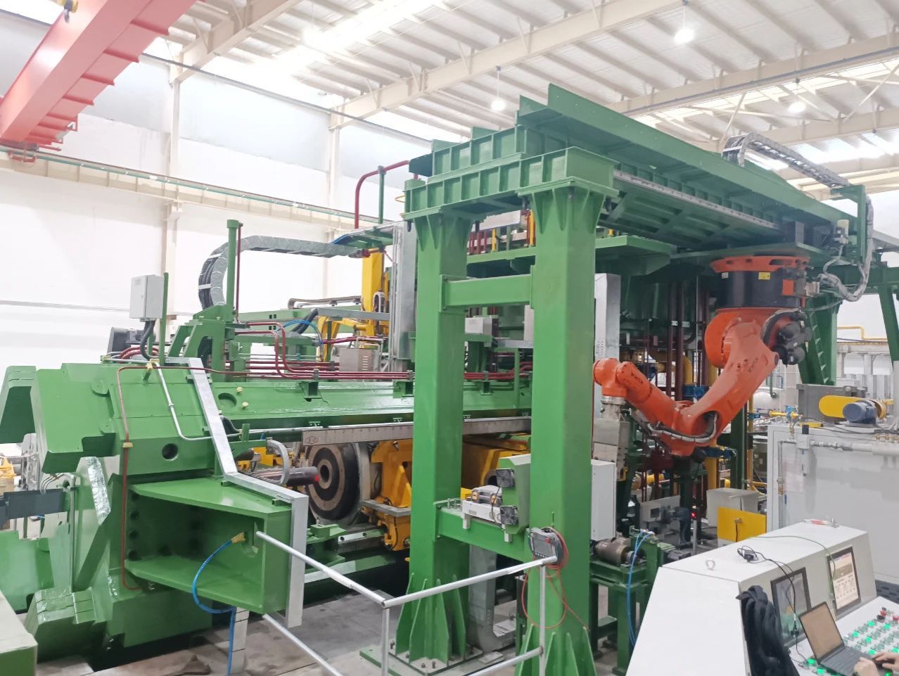與時(shí)間賽跑,用質(zhì)量說(shuō)話。近日,太重濱海公司傳來(lái)喜報(bào),在工作人員通力配合、努力奮戰(zhàn)下,28MN反向銅擠壓機(jī)順利完成熱負(fù)荷試車工作。這不僅是對(duì)智能化、智慧化設(shè)備技術(shù)升級(jí)的成功實(shí)踐,更是對(duì)太重服務(wù)質(zhì)量、響應(yīng)速度的一次重大考驗(yàn)。太重自主研發(fā)的28MN反向銅擠壓機(jī)是用于擠壓生產(chǎn)銅合金線材產(chǎn)品的設(shè)備,集自動(dòng)化、智能化、高端化于一體,在節(jié)能環(huán)保、平穩(wěn)運(yùn)行、安全性能等方面處于行業(yè)領(lǐng)先水平。此臺(tái)擠壓機(jī),在技術(shù)上進(jìn)行了升級(jí)迭代,將設(shè)備輔助機(jī)構(gòu)中的液壓驅(qū)動(dòng)部分,升級(jí)為伺服控制或電氣驅(qū)動(dòng)裝置,大幅降低了輔助機(jī)構(gòu)中液壓系統(tǒng)所占比例,既能縮短非擠壓時(shí)間、提高生產(chǎn)效率,也能保證設(shè)備的高控制精度、低故障率。同時(shí),模具循環(huán)系統(tǒng)特別采用模具循環(huán)機(jī)器人,實(shí)現(xiàn)了模具加熱、打磨、拆模、裝模自動(dòng)化循環(huán)。 與普通擠壓機(jī)相比,反向銅擠壓機(jī)輔助機(jī)構(gòu)數(shù)量更多,工藝流程更為復(fù)雜,調(diào)試任務(wù)也更加繁重??紤]到用戶的生產(chǎn)節(jié)奏,項(xiàng)目進(jìn)入調(diào)試階段后,公司技術(shù)中心鍛壓所技術(shù)人員和鍛壓設(shè)備分廠現(xiàn)場(chǎng)安調(diào)人員相互配合,加快調(diào)試進(jìn)度,晚上測(cè)試設(shè)備運(yùn)行情況、發(fā)現(xiàn)問題,白天調(diào)試設(shè)備、解決問題,團(tuán)隊(duì)齊心協(xié)力搶工期,克服種種困難將調(diào)試周期提前了7天,順利完成設(shè)備熱負(fù)荷試車。 錨定新質(zhì)生產(chǎn)力,釋放發(fā)展新動(dòng)能。該項(xiàng)目的順利試車是制造業(yè)與智能化的又一次深度融合,是“太重制造”向“太重智造”轉(zhuǎn)型的成功之舉,也是公司交給用戶的一份完美答卷。未來(lái),太重將繼續(xù)堅(jiān)持創(chuàng)新引領(lǐng),提升服務(wù)質(zhì)量,以新產(chǎn)品、新技術(shù)推動(dòng)行業(yè)進(jìn)步,以優(yōu)質(zhì)服務(wù)獲得更多用戶信任,勇當(dāng)高質(zhì)量高速度發(fā)展路上的“排頭兵”。