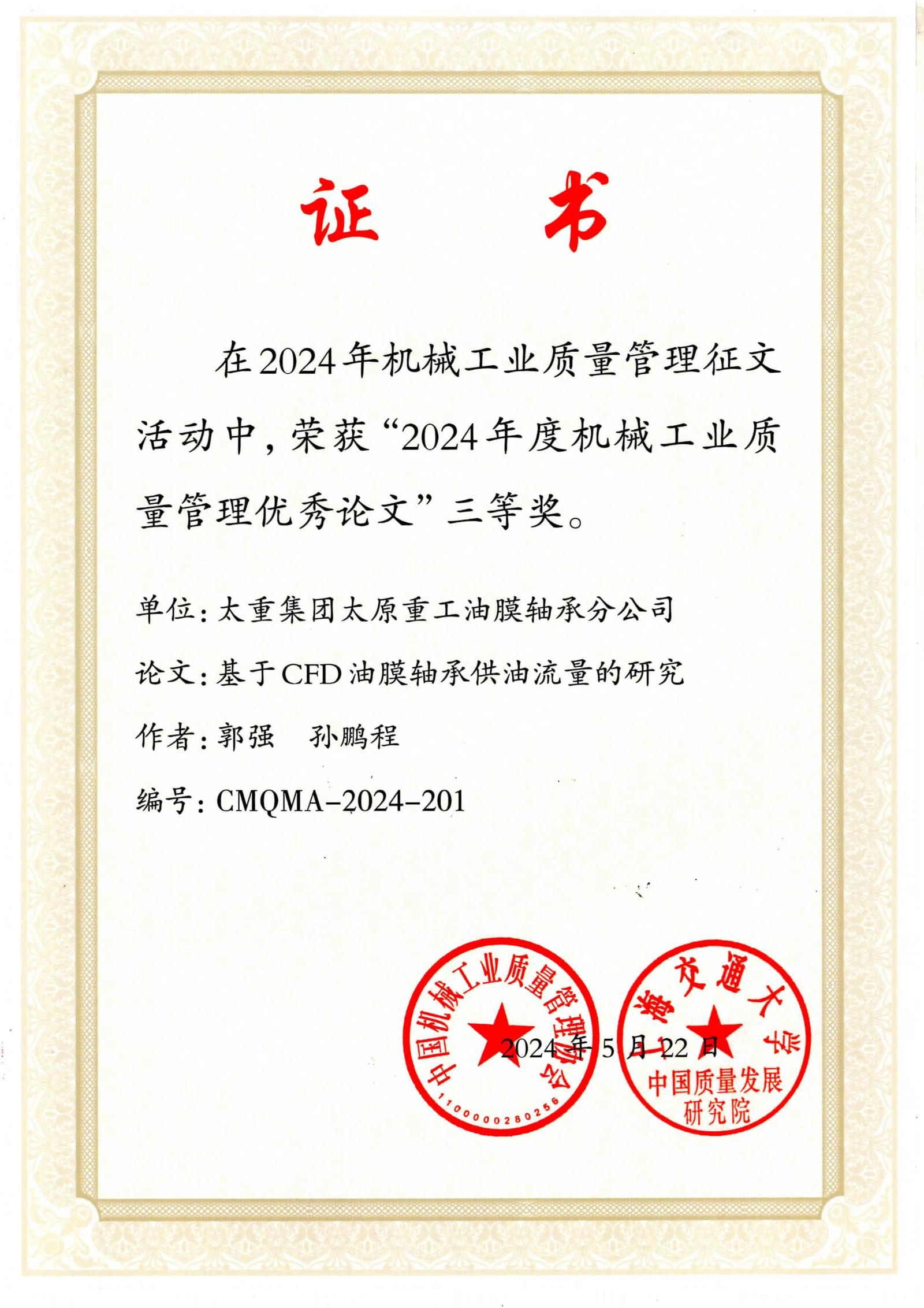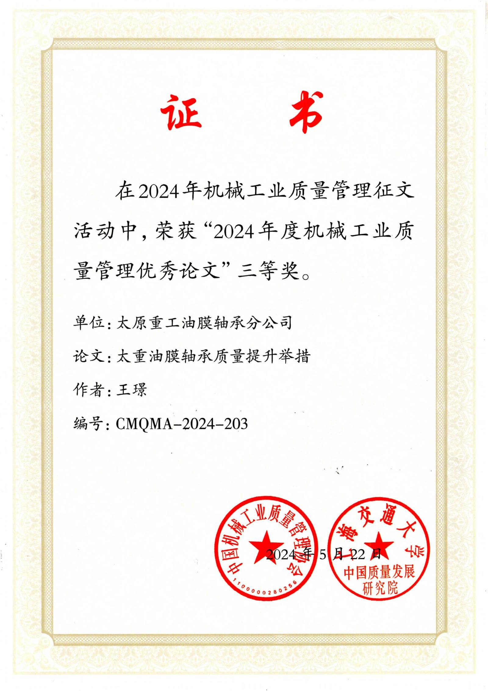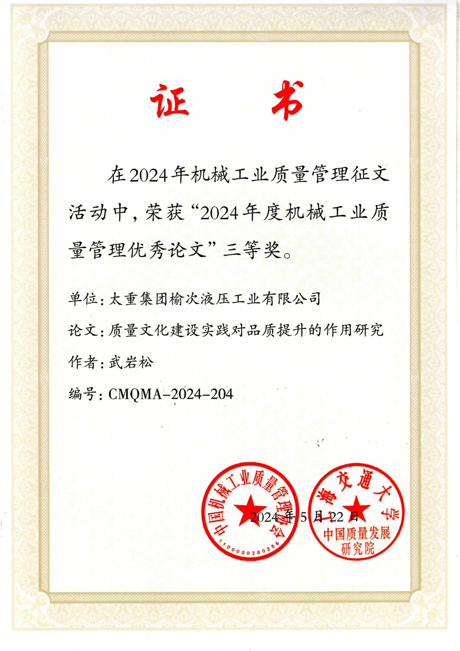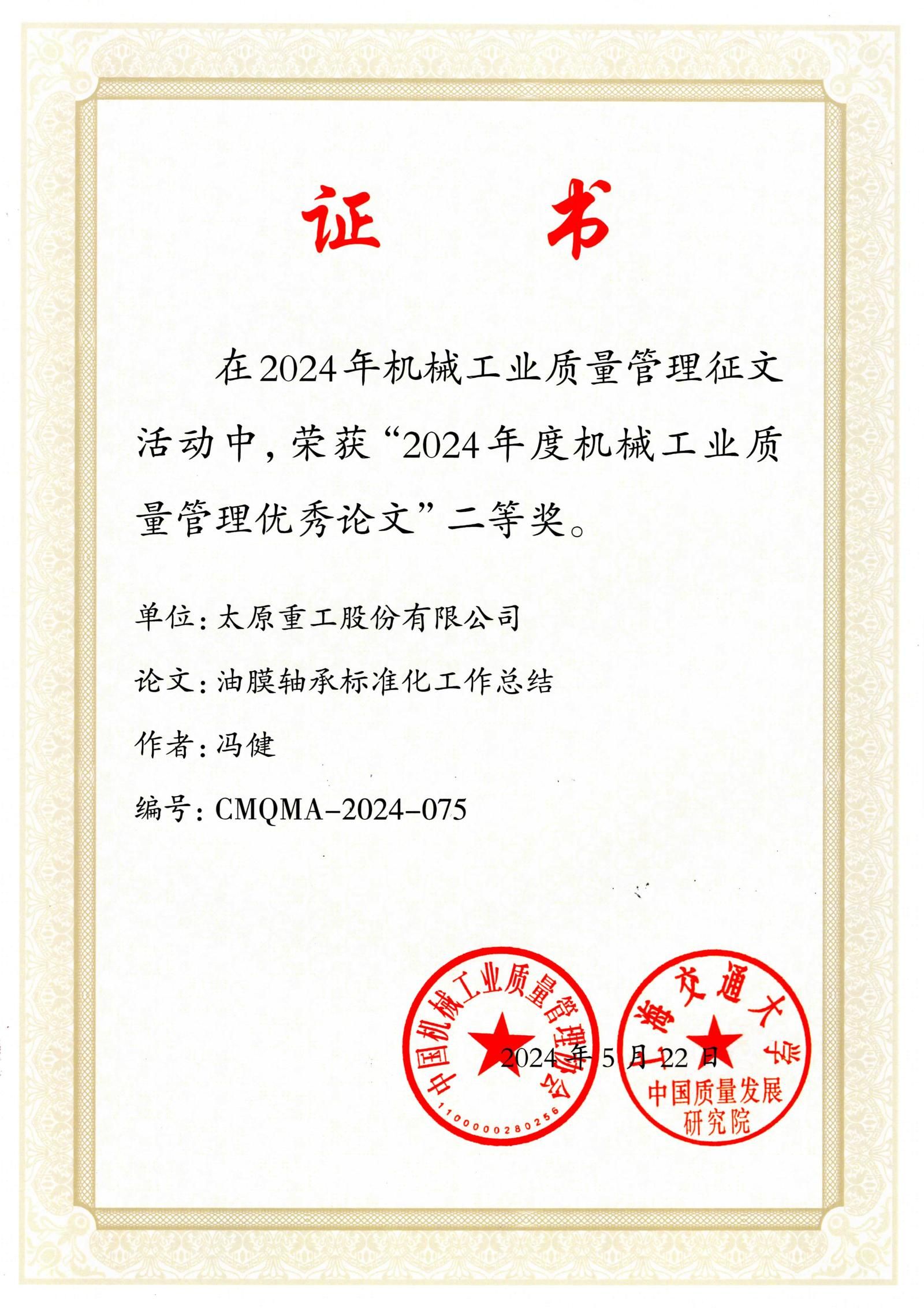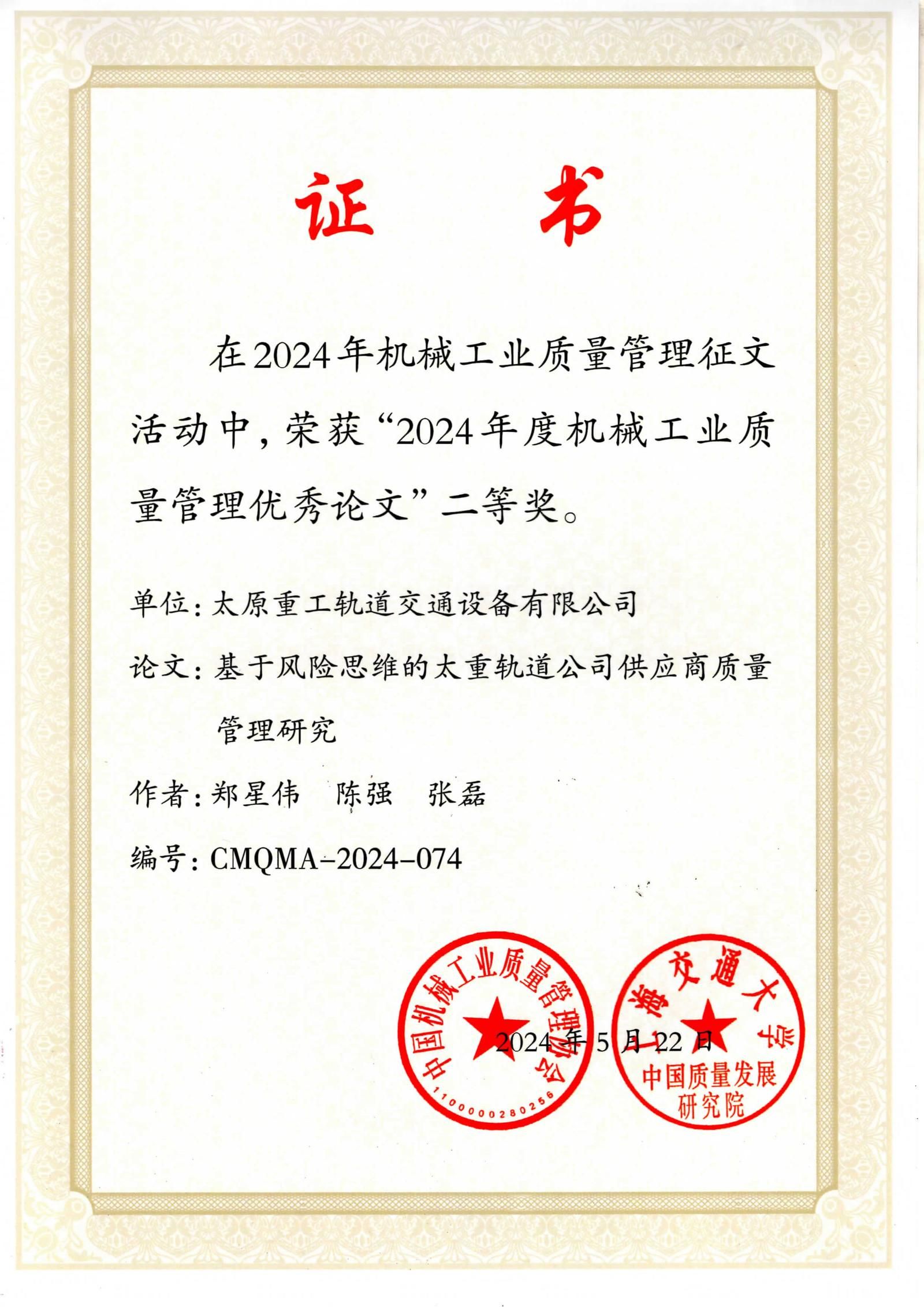 本次優(yōu)秀論文評選由業(yè)內知名專家組成評審團,從創(chuàng)新性、實用性、影響力等多個維度進行綜合評價,旨在挖掘并推廣機械工業(yè)質量管理領域的前沿理念和成功經(jīng)驗。該獎項申報門檻高、評審標準嚴,代表了行業(yè)領先水平。公司在此次評選中滿載而歸、碩果累累,是太重雄厚質量管理能力的有力見證,也折射出太重質量工作者潛心鉆研、追求卓越的創(chuàng)新精神。