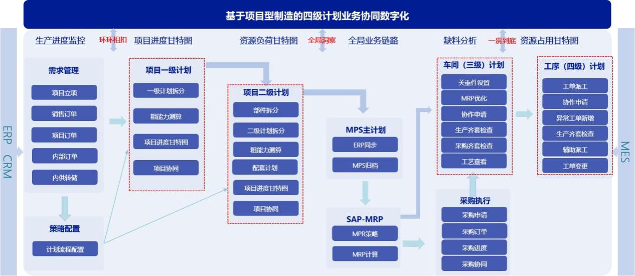 太重MOM平臺,通過引入數(shù)字化手段,構(gòu)建了一個橫跨制造管理、生產(chǎn)單元、采購配套等多業(yè)務(wù)環(huán)節(jié)的綜合管理系統(tǒng)。該系統(tǒng)采用了分級計劃管理模式,結(jié)合倒排和順排計劃方式,形成了“橫向到邊、縱向到底”的四級計劃體系。一級項目計劃關(guān)注產(chǎn)品從設(shè)計、工藝、采購、生產(chǎn)、發(fā)運到安調(diào)等全過程的節(jié)點控制;二級大部件計劃則根據(jù)一級計劃的節(jié)點要求,結(jié)合生產(chǎn)經(jīng)驗和產(chǎn)能評估數(shù)據(jù),設(shè)定大部件各工序的完成節(jié)點;三級零部件生產(chǎn)計劃和四級工序任務(wù)計劃聚焦零部件級別的生產(chǎn)執(zhí)行,依據(jù)ERP系統(tǒng)輸出的生產(chǎn)訂單,進行生產(chǎn)派工、調(diào)度、執(zhí)行等實際業(yè)務(wù)操作。這四層計劃緊密相連,不僅提升了項目型制造的生產(chǎn)運營管理效率,還實現(xiàn)了生產(chǎn)計劃的精細化管理和高效協(xié)同。