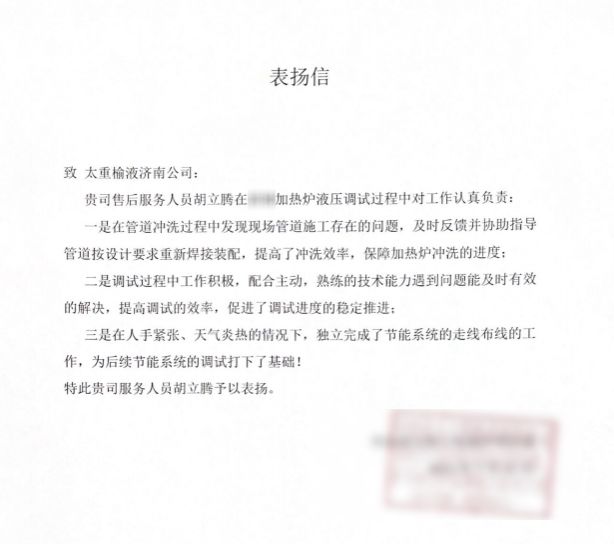 一封表揚(yáng)信,對公司售后服務(wù)人員專業(yè)的技術(shù)、敬業(yè)的精神予以高度贊揚(yáng)。為用戶交付設(shè)備后,安裝調(diào)試工作時間緊、任務(wù)重,公司立即派出經(jīng)驗(yàn)豐富的售后專員奔赴用戶現(xiàn)場,扎根作業(yè)一線、克服高溫酷暑,幫助用戶完成節(jié)能系統(tǒng)安裝以及電控的布線走線工作,與此同時,還對用戶的管路沖洗方案進(jìn)行優(yōu)化,為用戶提供切實(shí)可行的解決方案,提出專業(yè)建議,最大程度保障了用戶利益。