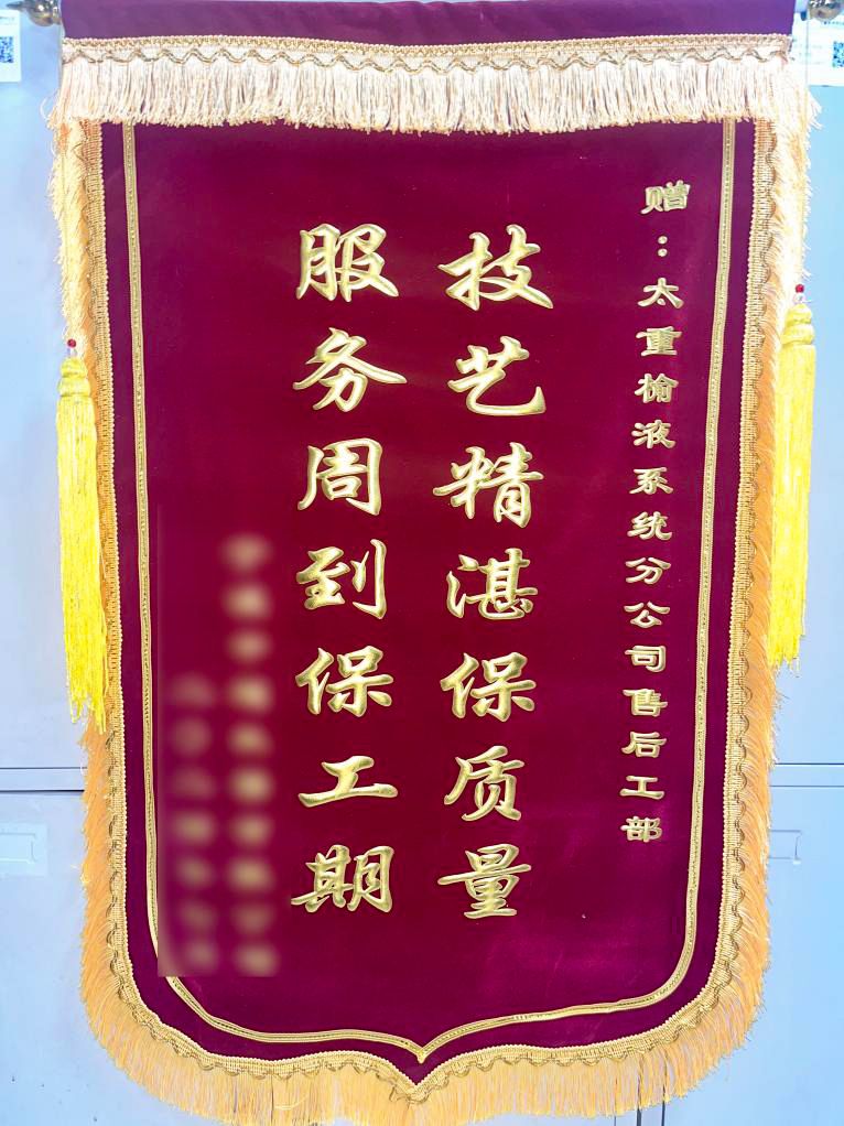 優(yōu)質(zhì)服務(wù)及時雨,鮮亮錦旗表心意。面對用戶生產(chǎn)現(xiàn)場的突發(fā)狀況,為了盡可能降低損失、保障用戶盡快復(fù)產(chǎn),太重榆液售后服務(wù)團(tuán)隊(duì)立即響應(yīng),奔赴用戶現(xiàn)場進(jìn)行實(shí)地勘察和技術(shù)分析,以最快的速度排查問題、解決問題,最大程度減小生產(chǎn)線停機(jī)對用戶造成的損失。用戶豎起大拇指說道:“太重的服務(wù)杠杠的!”