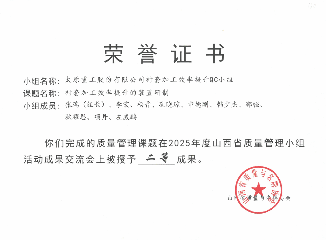 此外,還有太重榆液《提升真空泵定子合格率》、工程機(jī)械公司《降低中大挖動(dòng)臂焊后鉸接孔補(bǔ)孔率》、油膜分公司《襯套加工效率提升的裝置研制》、焦化公司《提升貨箱副車架的一次裝配合格率》四個(gè)項(xiàng)目榮獲全省二等成果。