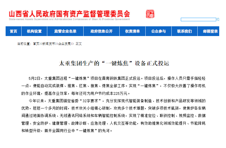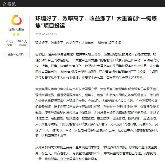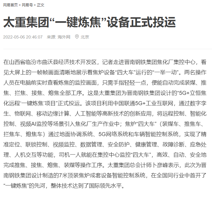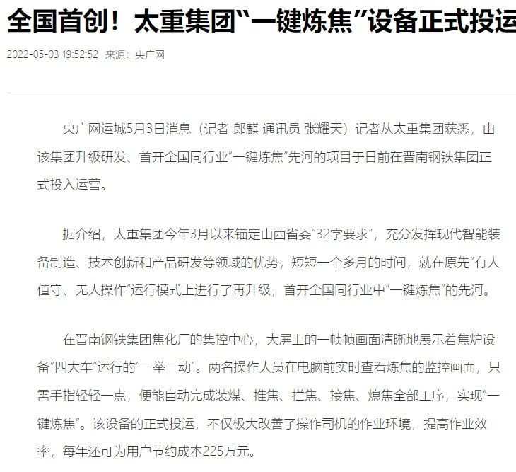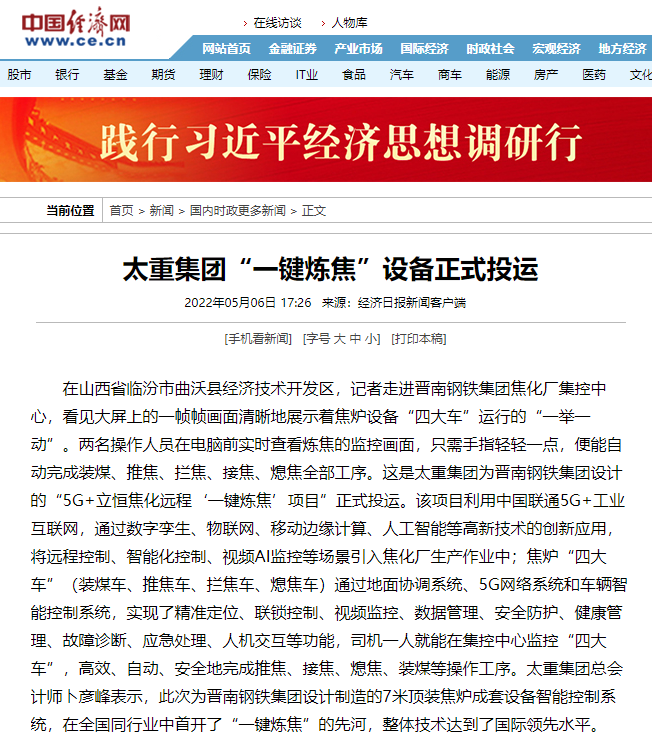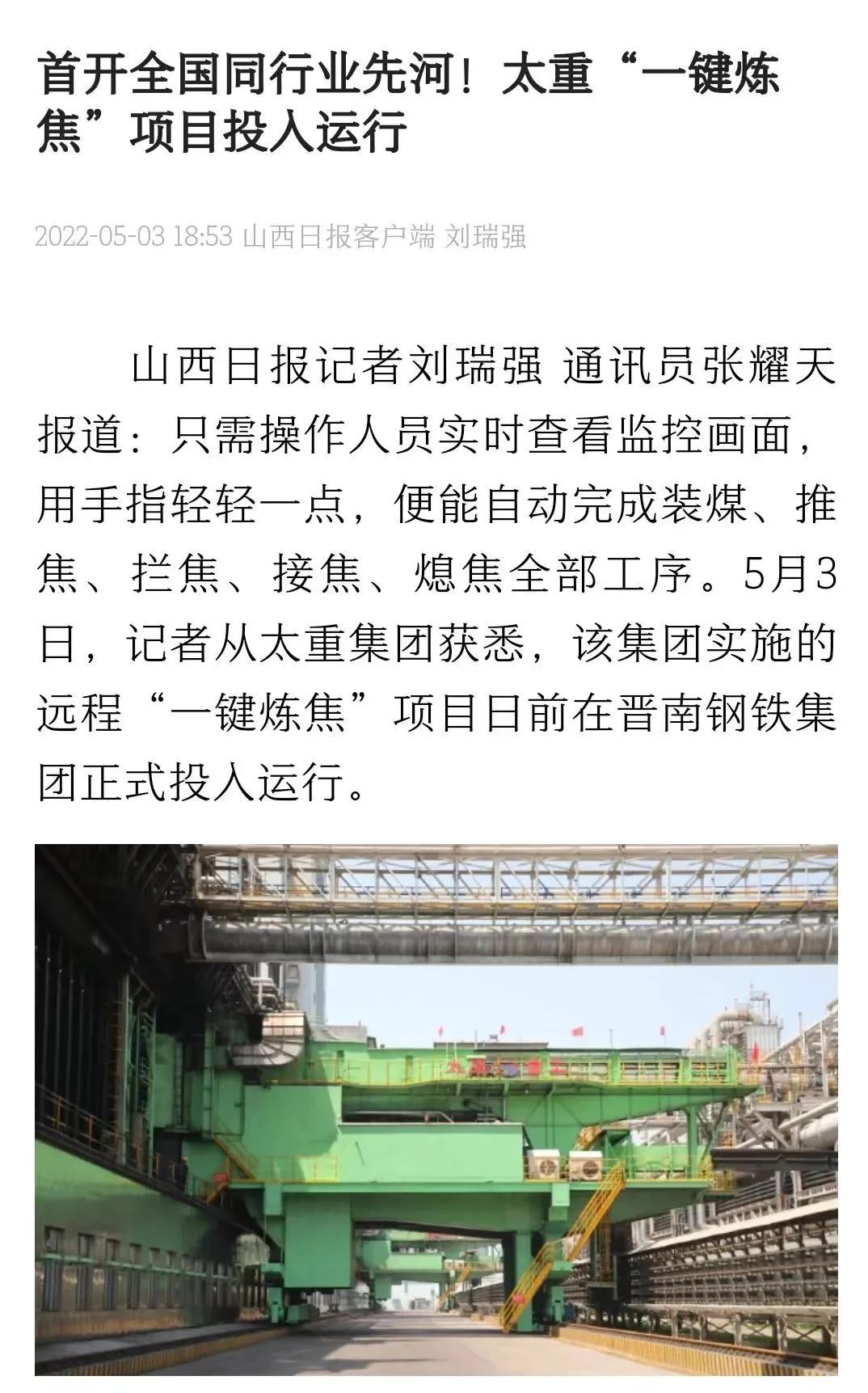 央廣網(wǎng)、中國鋼鐵新聞網(wǎng)、騰訊以《全國首創(chuàng)!太重集團“一鍵煉焦”設備正式投運》為題,聚焦太重集團以科技創(chuàng)新激發(fā)“智造”新活力為出發(fā)點,全面展示“智能+5G”在“一鍵煉焦”上的應用,助力焦化領(lǐng)域效能提升、節(jié)能降耗和轉(zhuǎn)型升級。中國經(jīng)濟網(wǎng)、網(wǎng)易、山西國資以《太重集團“一鍵煉焦”設備正式投運》為題,報道太重集團“一鍵煉焦”項目正式開啟智能煉焦新時代,填補技術(shù)空白,開創(chuàng)國內(nèi)焦化行業(yè)先河。搜狐網(wǎng)以《環(huán)境好了,效率高了,收益漲了!太重首創(chuàng)“一鍵煉焦”項目投運》為題,重點展示了太重集團“一鍵煉焦”項目成果,實現(xiàn)智能綠色工廠轉(zhuǎn)型再升級。山西日報、山西晚報、太原日報分別以《首開全國同行業(yè)先河!太重“一鍵煉焦”項目投入運行》《太重大發(fā)明:動動手指“一鍵煉焦”》《太重首創(chuàng)“一鍵煉焦”項目投運》為題,聚焦太重“智造”再提速,充分展現(xiàn)公司以“三性五化”為新產(chǎn)品開發(fā)目標,助力國家實現(xiàn)“雙碳”目標。