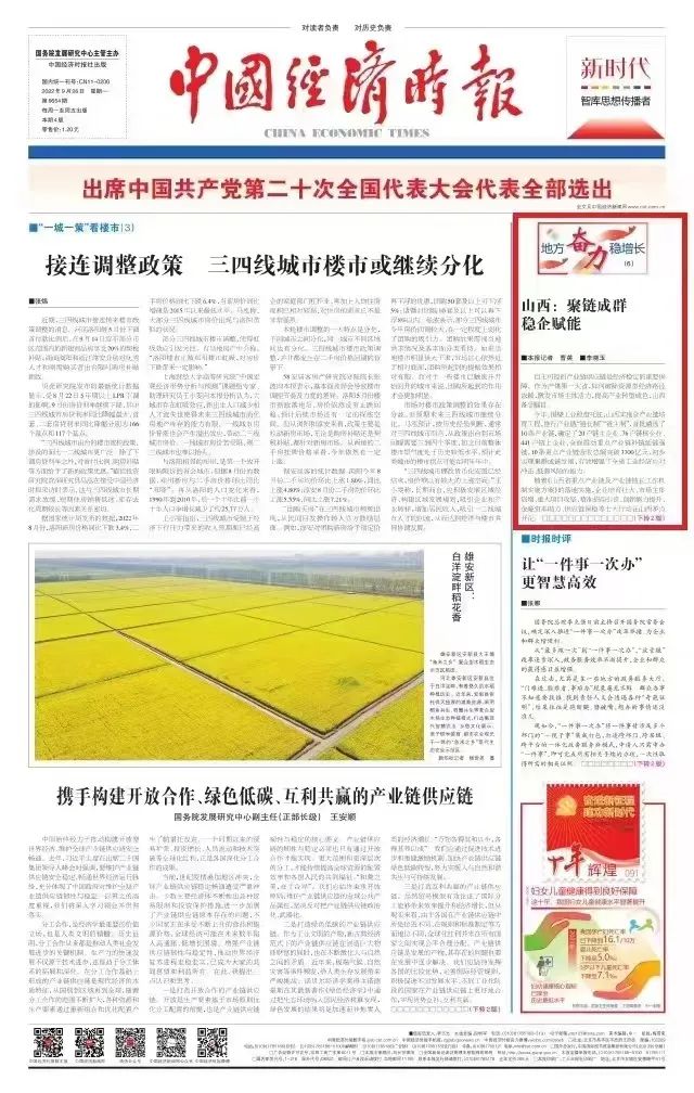 今日,中國經(jīng)濟時報頭版以《山西:聚鏈成群 穩(wěn)企賦能》為題,重點關(guān)注太重集團憑借在高端裝備制造和風電裝備領(lǐng)域的突出優(yōu)勢,成為山西省唯一的“雙鏈主”企業(yè),主動發(fā)揮“鏈主”企業(yè)的引領(lǐng)支撐作用,精準延鏈補鏈強鏈,推動形成全省“一企帶一鏈、一鏈帶一片”的產(chǎn)業(yè)發(fā)展格局。