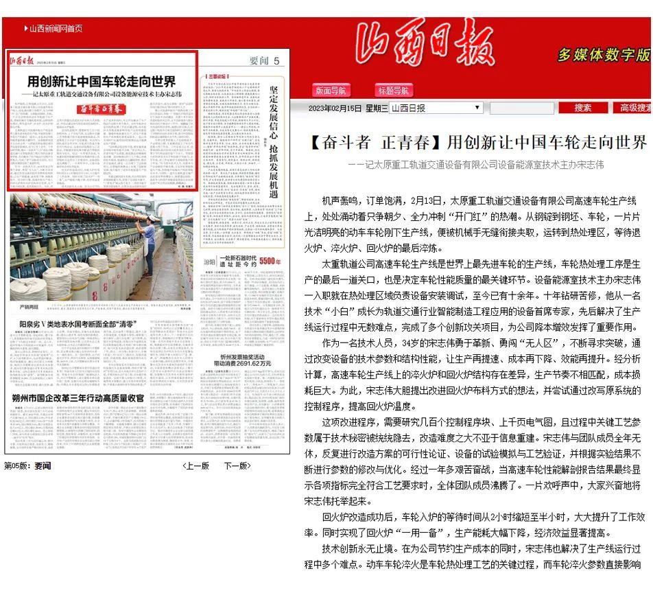 今天的《山西日報》對太重軌道交通公司設備能源室技術主辦宋志偉帶領創(chuàng)新團隊,在太重高質量高速度發(fā)展進程中,以永不懈怠的奮進姿態(tài)做出突出貢獻的生動事跡進行了聚焦報道。