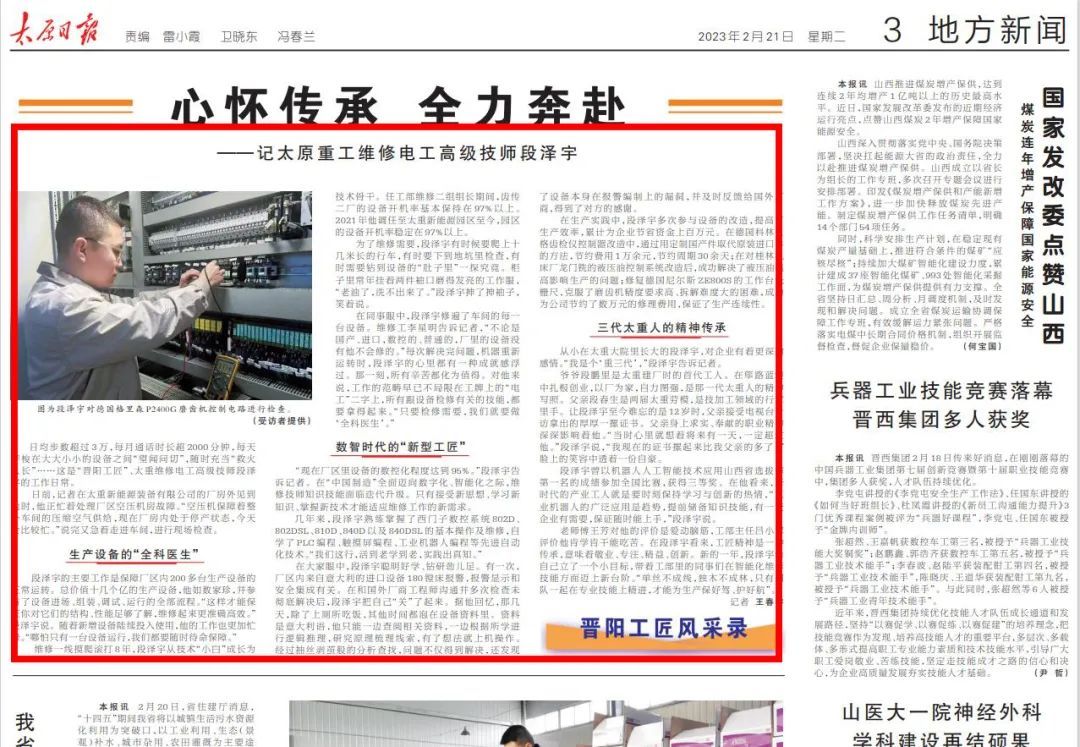 日前,太重集團(tuán)齒輪傳動(dòng)分公司電工段澤宇榮獲了太原市第四屆“晉陽(yáng)工匠”榮譽(yù)稱號(hào)?!短?qǐng)?bào)》于日前對(duì)其事跡進(jìn)行了宣傳報(bào)道。