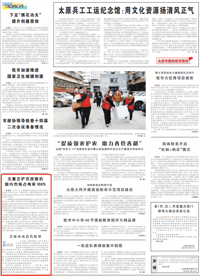 近期,太原日報以《太重正鏟式挖掘機國內(nèi)市場占有率100%》為題對太重集團(tuán)礦用挖掘機勇登行業(yè)“塔尖”進(jìn)行報道。太重集團(tuán)大力實施科技創(chuàng)新和人才強企戰(zhàn)略,堅持把創(chuàng)新擺在公司轉(zhuǎn)型發(fā)展全局的核心位置,為太重在全省轉(zhuǎn)型發(fā)展中發(fā)揮龍頭帶動作用聚力賦能。