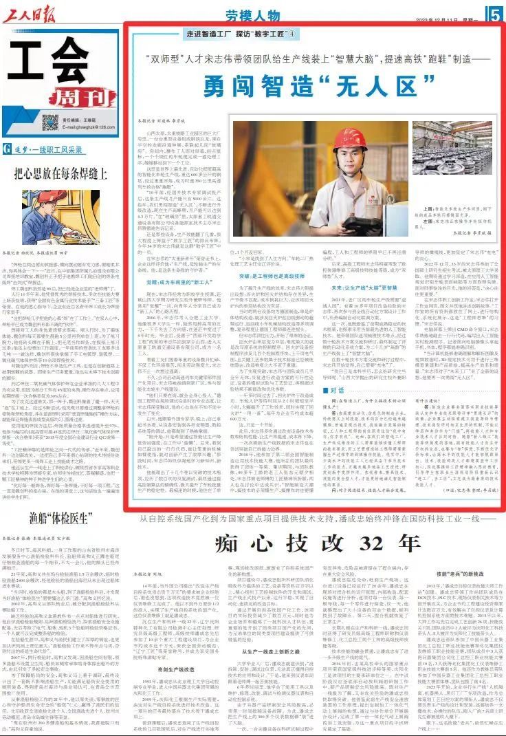 近日,《工人日報》對太重軌道公司設(shè)備能源室技術(shù)主辦宋志偉勇于創(chuàng)新、勇闖智造“無人區(qū)”,為高鐵打造合格“跑鞋”的先進事跡進行了聚焦報道。從覺醒成為一名新時代的工人到“雙師型”人才的突破,再到勇闖“無人區(qū)”,為生產(chǎn)線裝上了“智慧大腦”,宋志偉不斷攀登科研技術(shù)高峰,攻克多項科技創(chuàng)新難點,不斷用熱情和力量踐行著強國有我的青年擔當。
