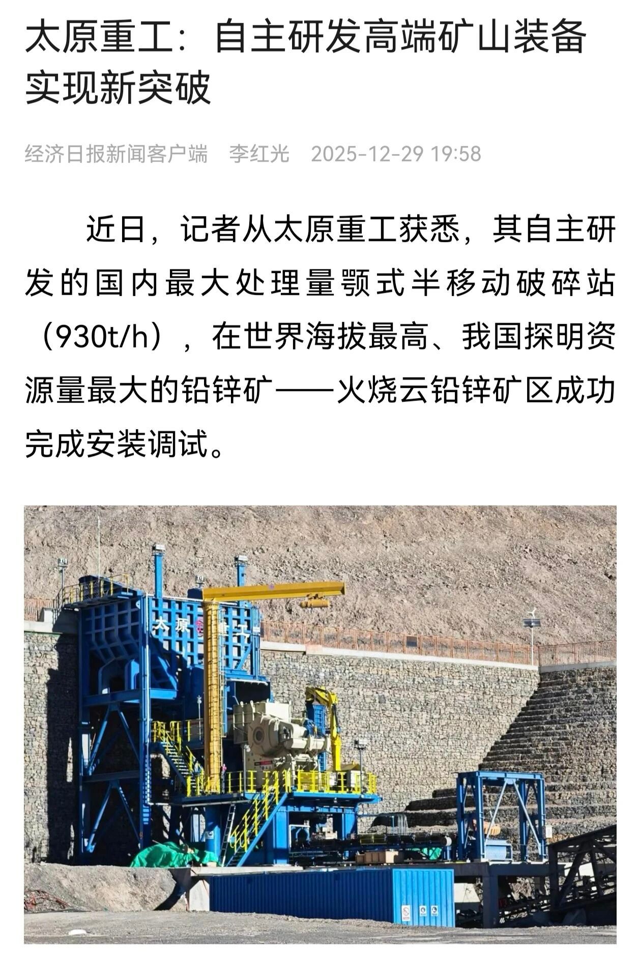 在世界海拔最高的礦山極端環(huán)境中,太原重工通過突破性技術(shù)方案,成功解決高寒缺氧工況下大型裝備的穩(wěn)定運(yùn)行與耐久性難題,實(shí)現(xiàn)智能化高效作業(yè)。標(biāo)志著我國(guó)高端礦山裝備在極端環(huán)境下取得重大技術(shù)突破,展現(xiàn)了“中國(guó)制造”不斷攀登世界高度的硬核實(shí)力。